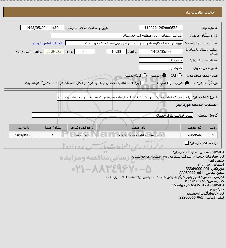 شرح کلی نیاز: پایدار سازی فوندانسیون برج 151 خط 132 کیلو ولت شوشتر -تمبی به شرح خدمات پیوست