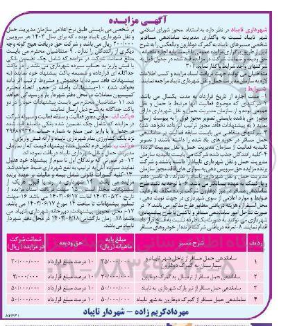 | 3 | ساماندهی حمل مسافر از تیر پارک شهرداری تایباد | 50.000.000 | 10 درصد مبلغ قرارداد | 50.000.000 |
