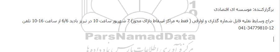 حراج وسایط نقلیه قابل شماره گذاری و اوارقی ( فقط به مراکز اسقاط دارای مجوز) 7 شهریور ساعت 10 در تبریز بادید 6/6 از ساعت 16-10 تلفن 12-34779810-041