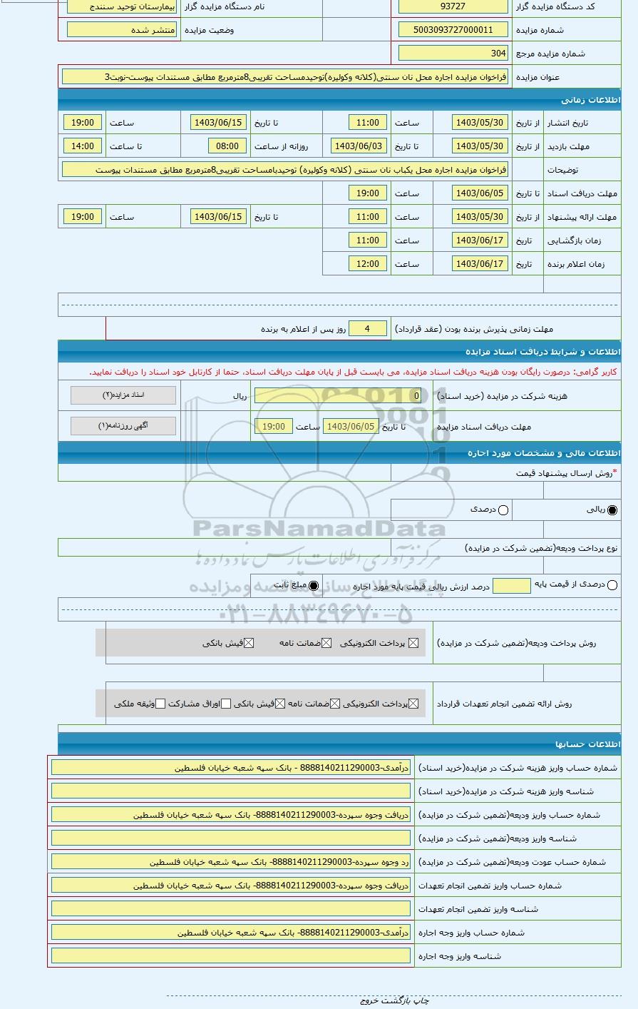 | شماره مورد اجاره | 5103093727000011 | نوع برگزاری مزایده | مزایده عمومی | |