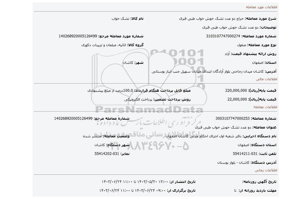 | نام دستگاه اجرایی: دفتر شعبه اول اجرای احکام مدنی کاشان اصفهان | وضعیت معامله: منتشر شده | |