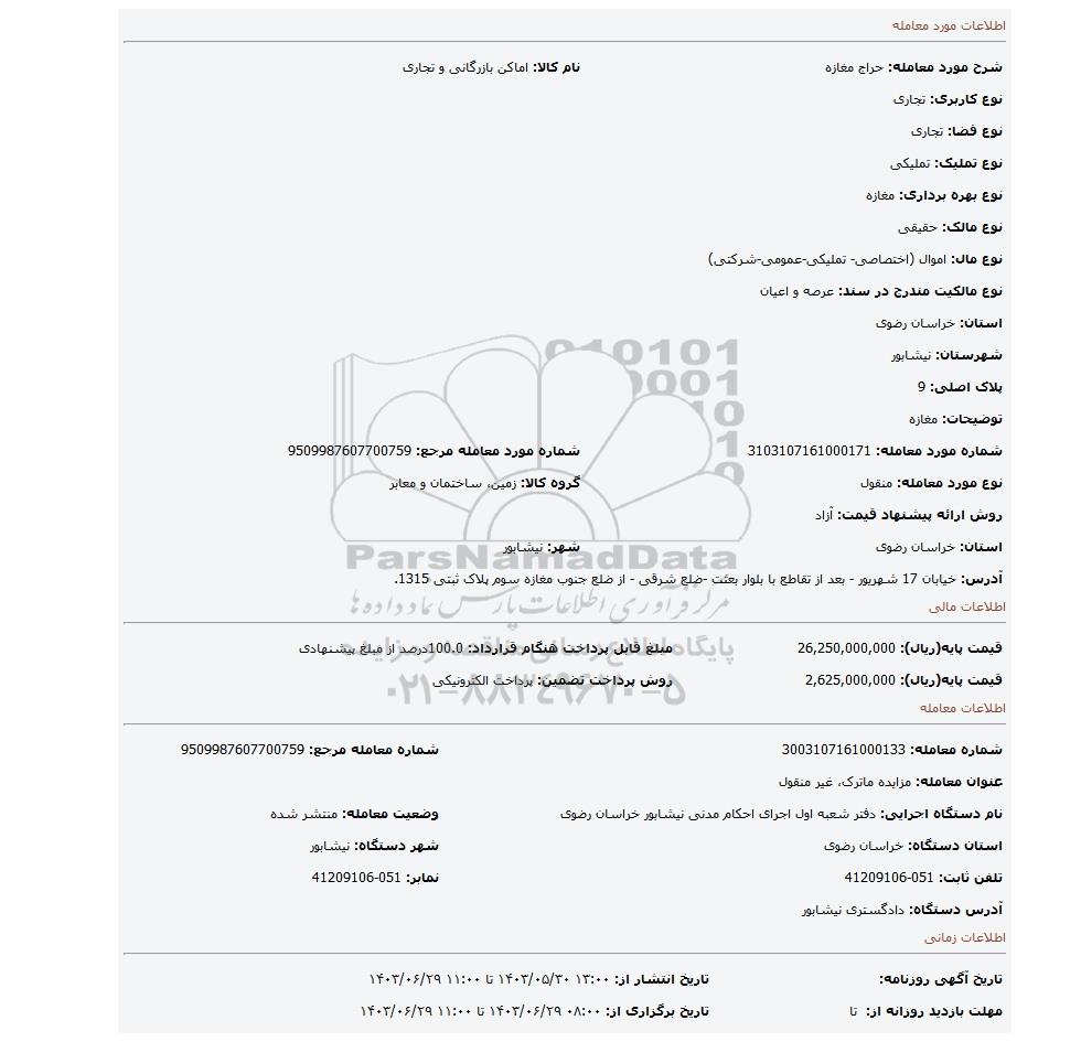 | شماره مورد معامله: 3103107161000171 | شماره مورد معامله مرجع: 9509987607700759 | |