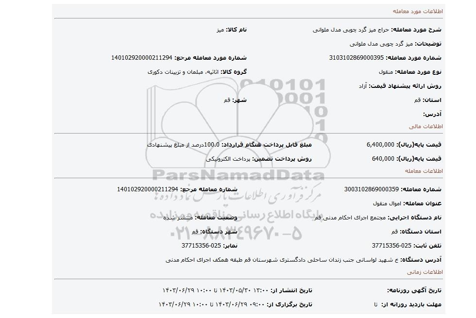 | شماره مورد معامله: 3103102869000395 | شماره مورد معامله مرجع: 140102920000211294 | |