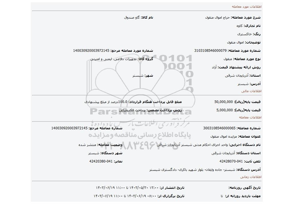 شرح مورد معامله: حراج اموال منقولنام کالا: گاو صندوق