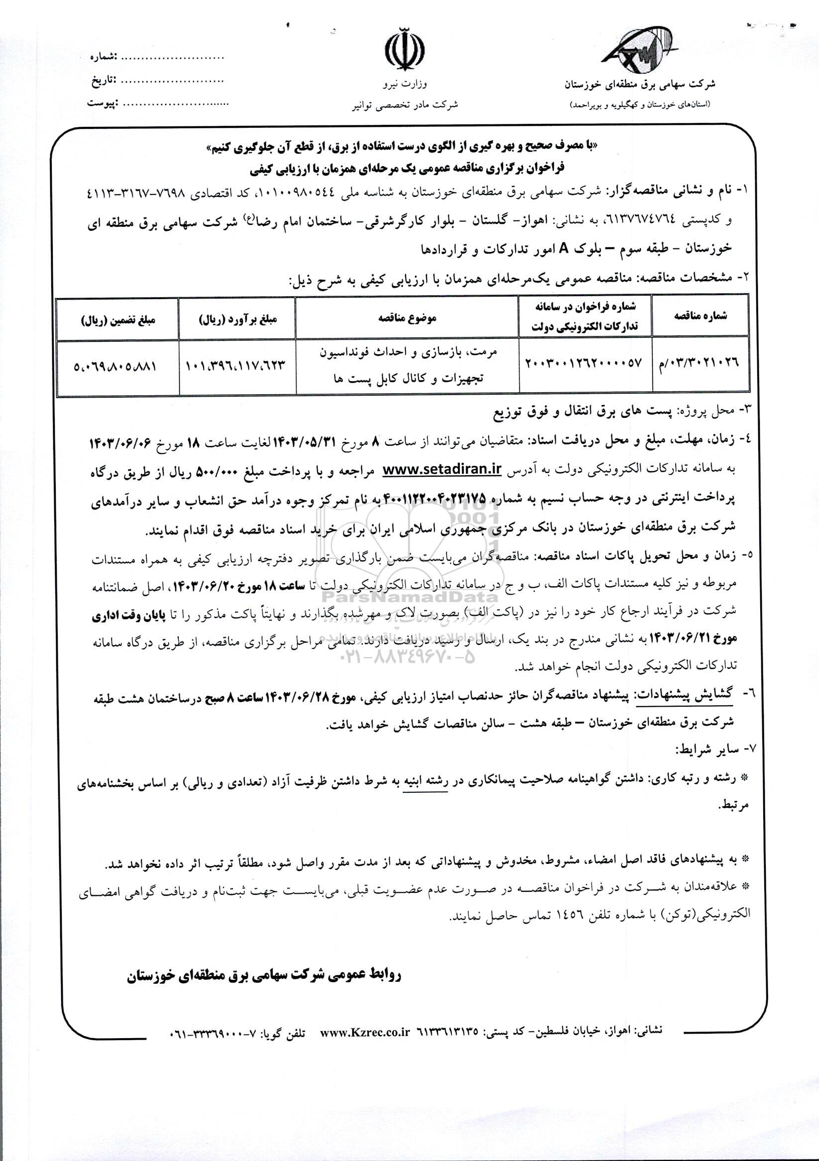 6- گشایش پیشنهادات پیشنهاد مناقصه گران حائز حد نصاب امتیاز ارزیابی کیفی مورخ 1403.6.28 ساعت 8 صبح در ساختمان هشت طبقه شرکت برق منطقه ای خوزستان - طبقه هشت - سالن مناقصات گشایش خواهد یافت.