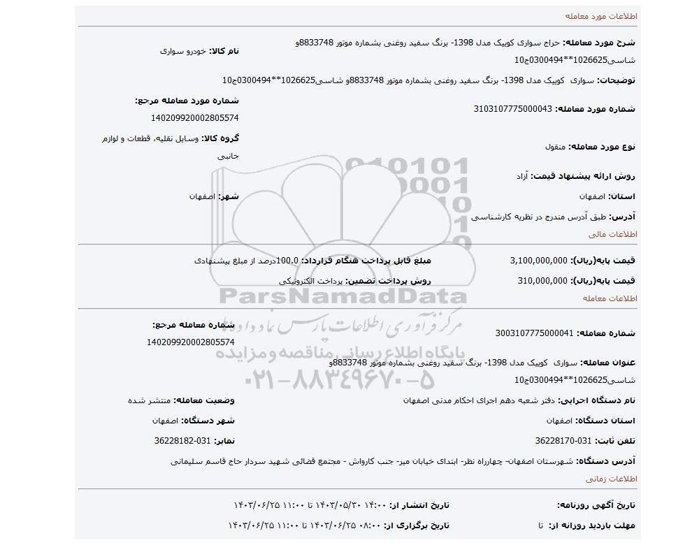 | شماره مورد معامله: 3103107775000043 | شماره مورد معامله مرجع: 140209920002805574 | |