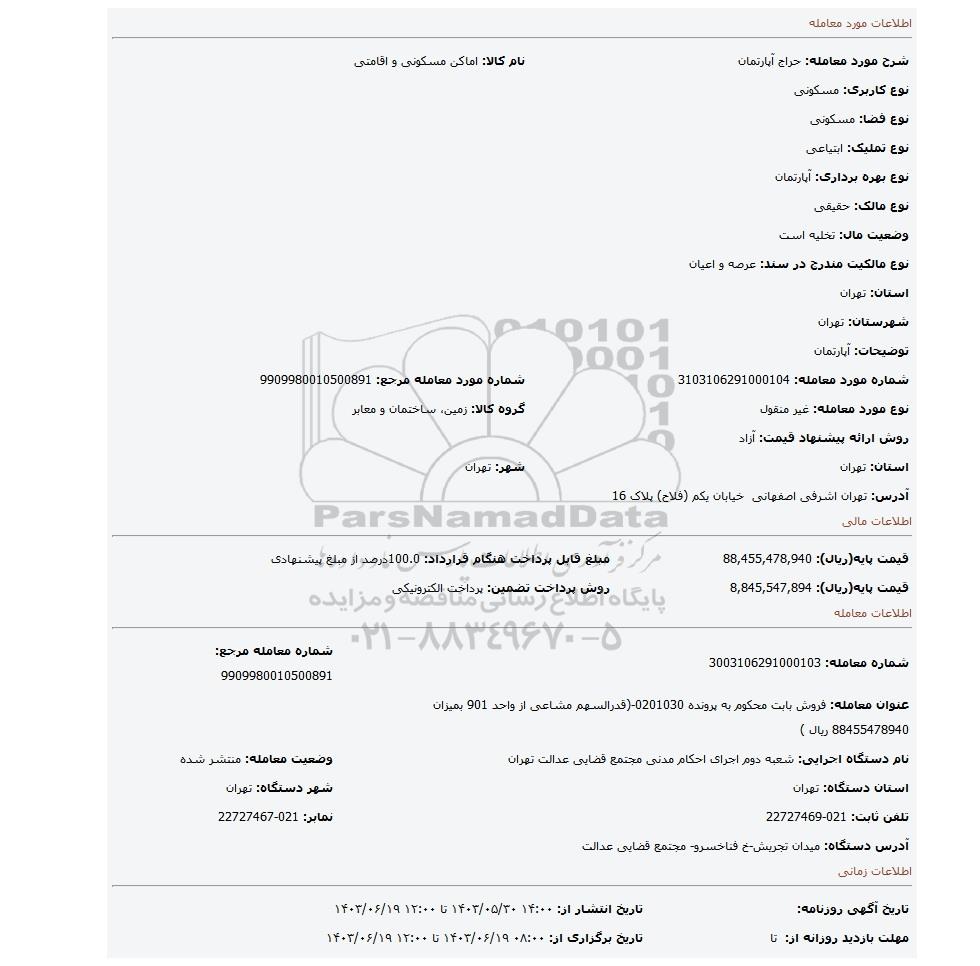 عنوان معامله: فروش بابت محکوم به پرونده 0201030-(قدرالسهم مشاعی از واحد 901 بمیزان 88455478940 ریال )