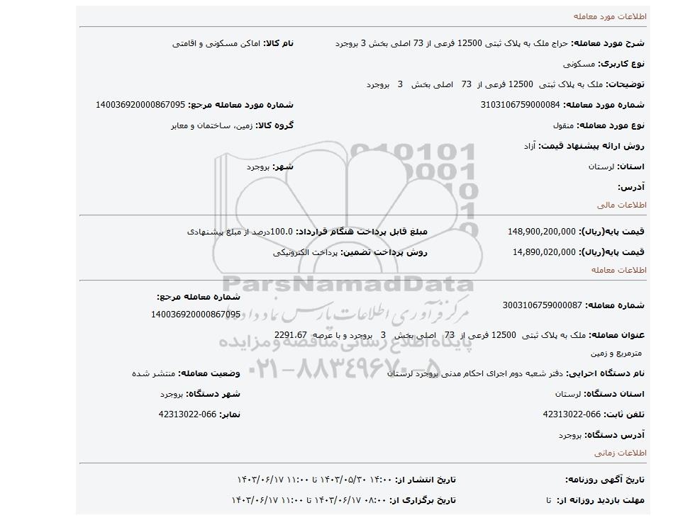 | شرح مورد معامله: حراج ملک به پلاک ثبتی 12500 فرعی از 73 اصلی بخش 3 بروجرد | نام کالا: اماکن مسکونی و اقامتی | |