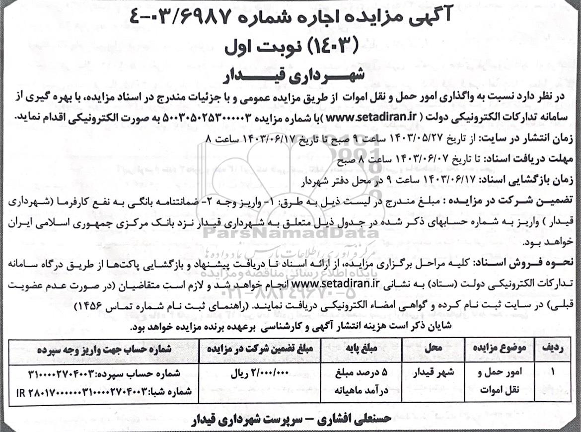 شهرداری قیدار در نظر دارد نسبت به واگذاری امور حمل و نقل اموات از طریق مزایده عمومی و با جزئیات مندرج در اسناد مزایده با بهره گیری از سامانه تدارکات الکترونیکی دولت ستاد ایران با شماره مزایده 5003050253000003 به صورت الکترونیکی اقدام نماید.