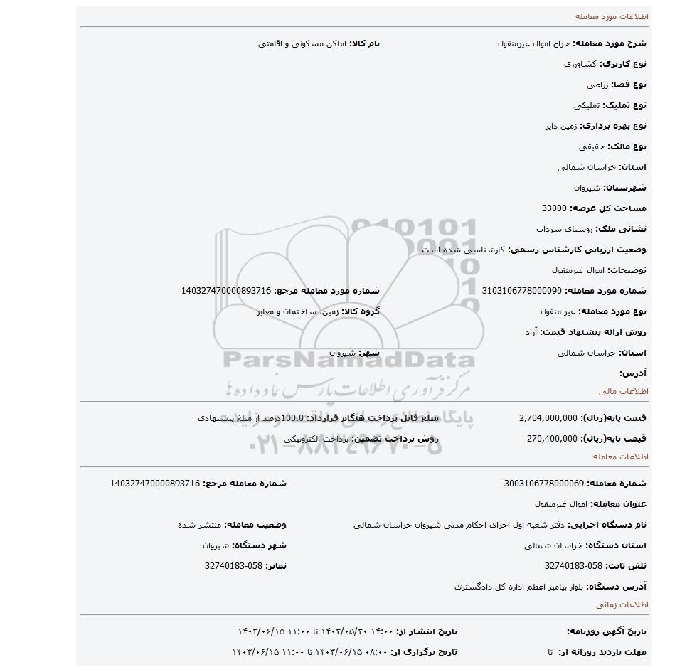 | شرح مورد معامله: حراج اموال غیرمنقول | نام کالا: اماکن مسکونی و اقامتی | |