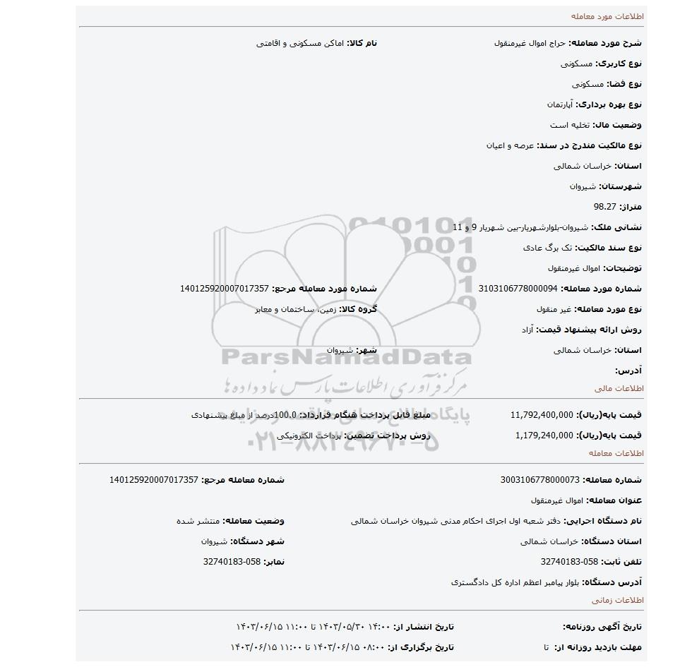 | شرح مورد معامله: حراج اموال غیرمنقول | نام کالا: اماکن مسکونی و اقامتی | |