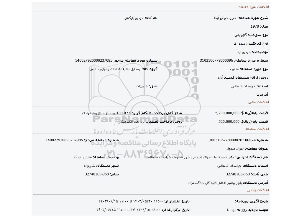 | نوع مورد معامله: منقول | گروه کالا: وسایل نقلیه، قطعات و لوازم جانبی | |
