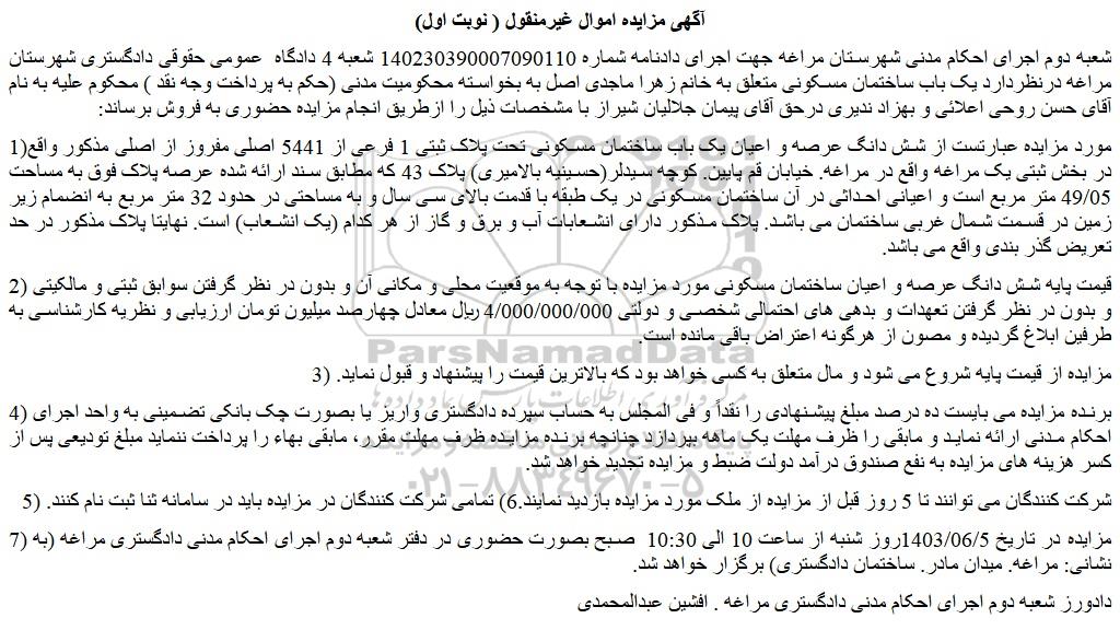 شعبه دوم اجرای احکام مدنی شهرستان مراغه جهت اجرای دادنامه شماره 140230390007090110 شعبه 4 دادگاه عمومی حقوقی دادگستری شهرستان مراغه درنظردارد یک باب ساختمان مسکونی متعلق به خانم زهرا ماجدی اصل به بخواسته محکومیت مدنی (حکم به پرداخت وجه نقد ) محکوم علیه به نام آقای حسن روحی اعلائی و بهزاد ندیری درحق آقای پیمان جلالیان شیراز با مشخصات ذیل را ازطریق انجام مزایده حضوری به فروش برساند: