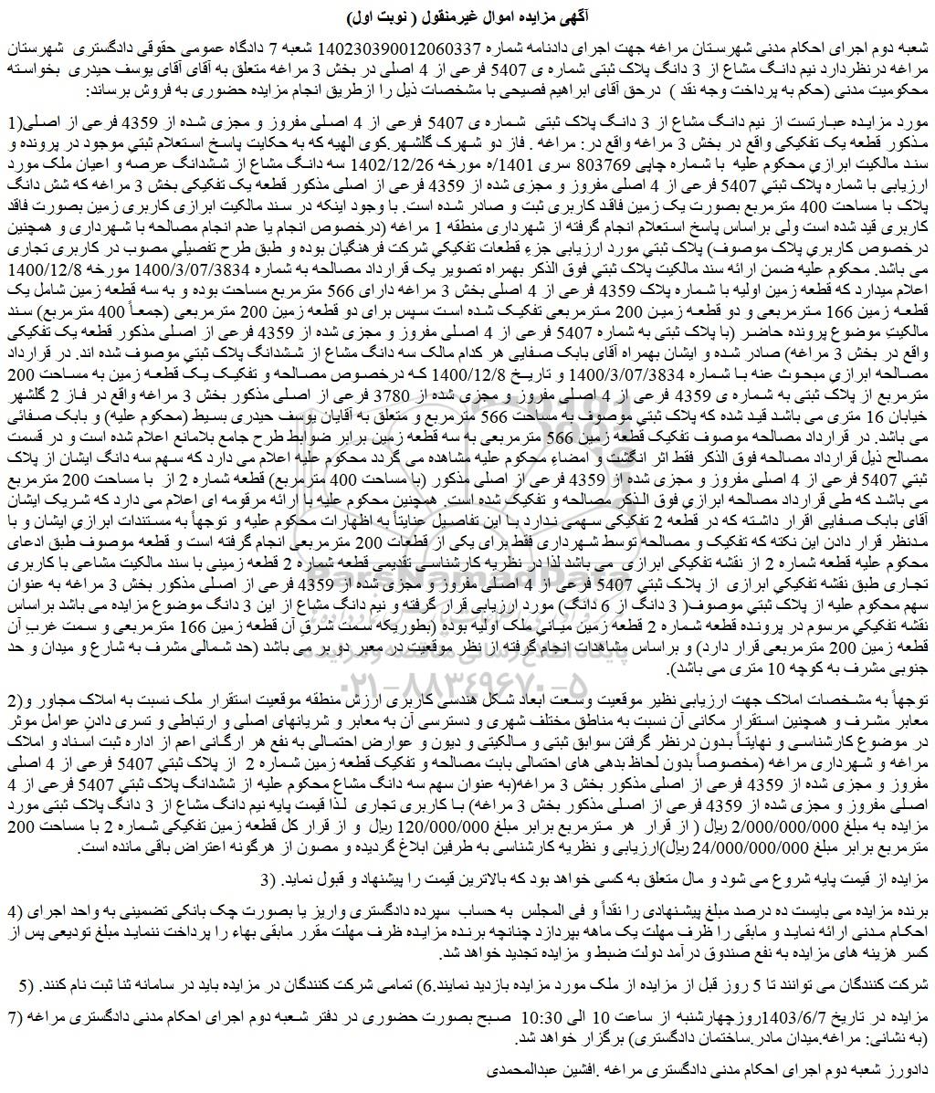 شعبه دوم اجرای احکام مدنی شهرستان مراغه جهت اجرای دادنامه شماره 140230390012060337 شعبه 7 دادگاه عمومی حقوقی دادگستری  شهرستان مراغه درنظردارد نیم دانگ مشاع از 3 دانگ پلاک ثبتی شماره ی 5407 فرعی از 4 اصلی در بخش 3 مراغه متعلق به آقای آقای یوسف حیدری  بخواسته محکومیت مدنی (حکم به پرداخت وجه نقد )  درحق آقای ابراهیم فصیحی با مشخصات ذیل را ازطریق انجام مزایده حضوری به فروش برساند: