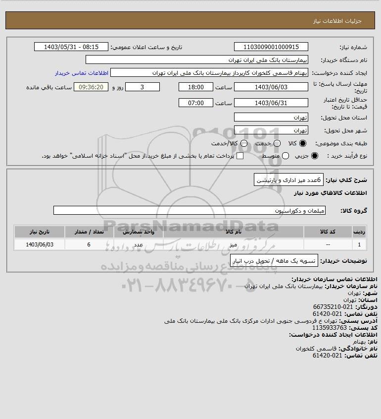 شرح کلی نیاز: 6عدد میز اداری و پارتیشن