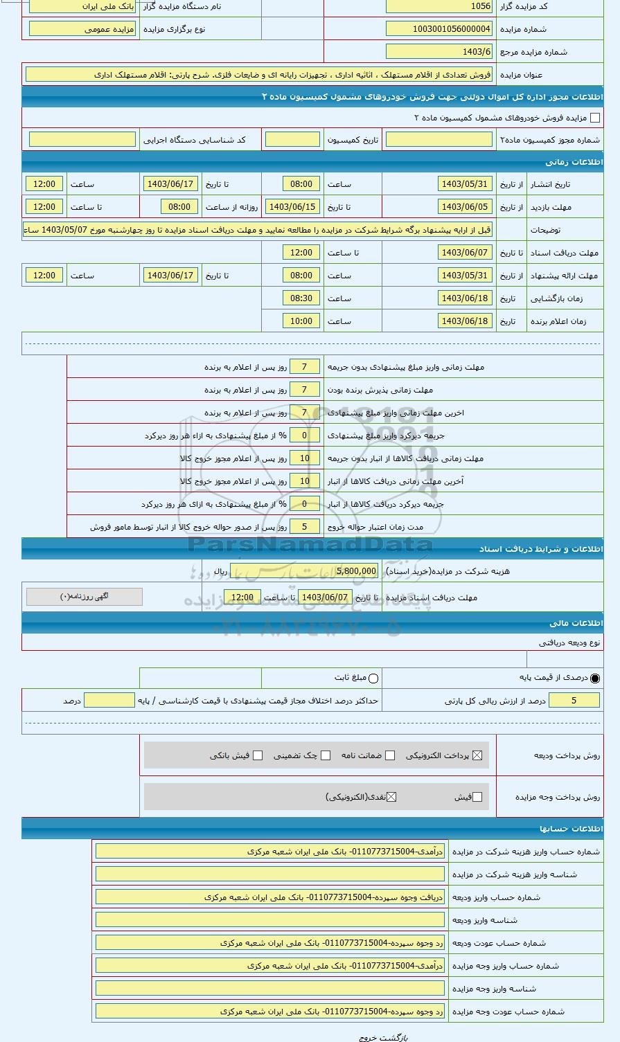 | کد مزایده گزار | 1056 | نام دستگاه مزایده گزار | بانک ملی ایران | |
