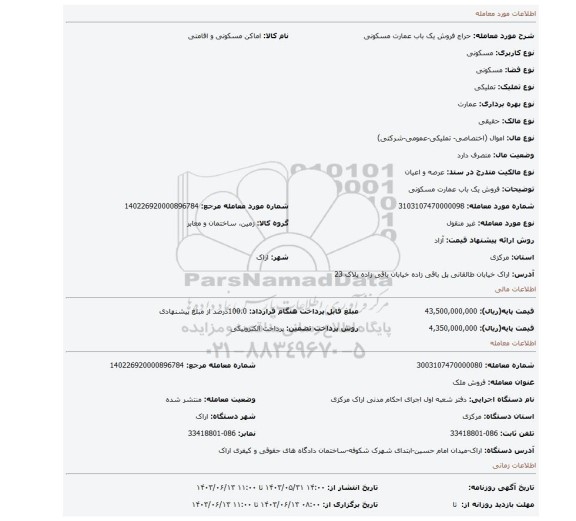 | شرح مورد معامله: حراج فروش یک باب عمارت مسکونی | نام کالا: اماکن مسکونی و اقامتی | |