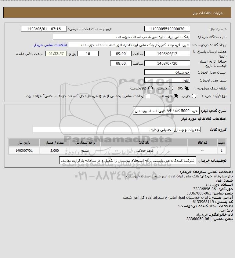 شرح کلی نیاز: خرید 5000 کاغذ A4 طبق اسناد پیوستی