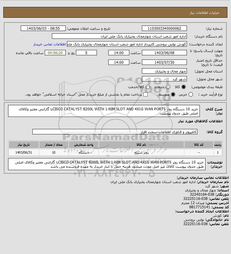شرح کلی نیاز: خرید 10 دستگاه روتر CISCO CATALYST 8200L WITH 1-NIM SLOT AND 4X1G WAN PORTSبا گارانتی معتبر وکالای اصلی طبق جدول پیوست
