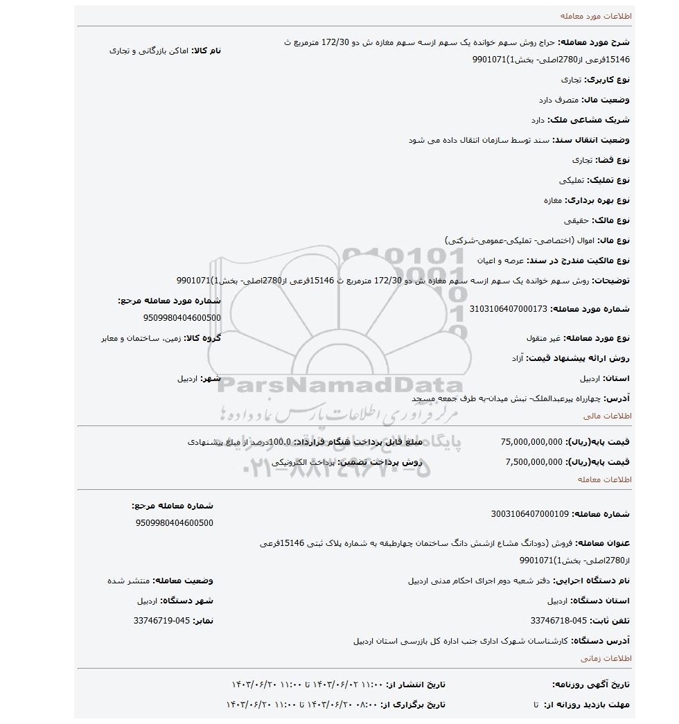 شرح مورد معامله: حراج روش سهم خوانده یک سهم ازسه سهم مغازه ش دو 172/30 مترمربع ث 15146فرعی از2780اصلی- بخش1)9901071 | نام کالا: اماکن بازرگانی و تجاری | |