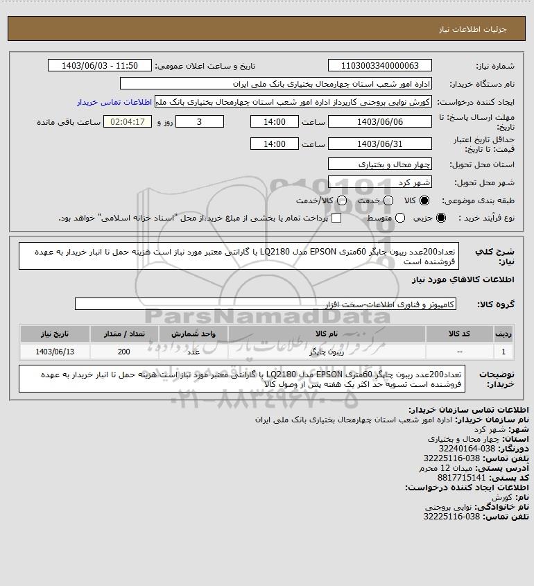 شرح کلی نیاز: تعداد200عدد ریبون چاپگر 60متری EPSON مدل LQ2180 با گارانتی معتبر مورد نباز است هزینه حمل تا انبار خریدار به عهده فروشنده است