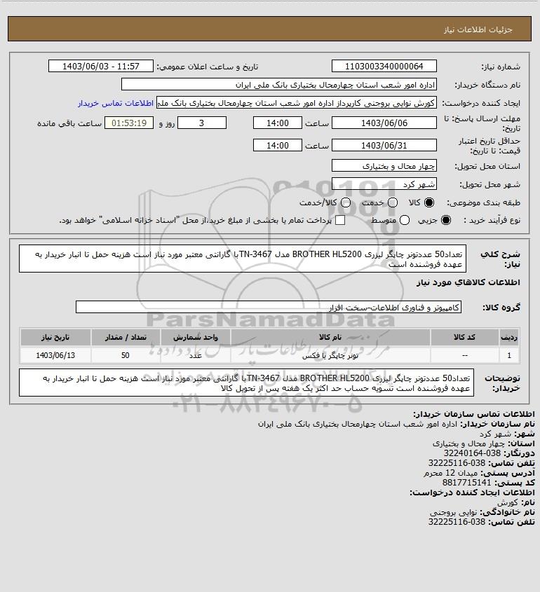 شرح کلی نیاز: تعداد50 عددتونر چاپگر لیزری BROTHER HL5200 مدل TN-3467با گارانتی معتبر مورد نباز است هزینه حمل تا انبار خریدار به عهده فروشنده است