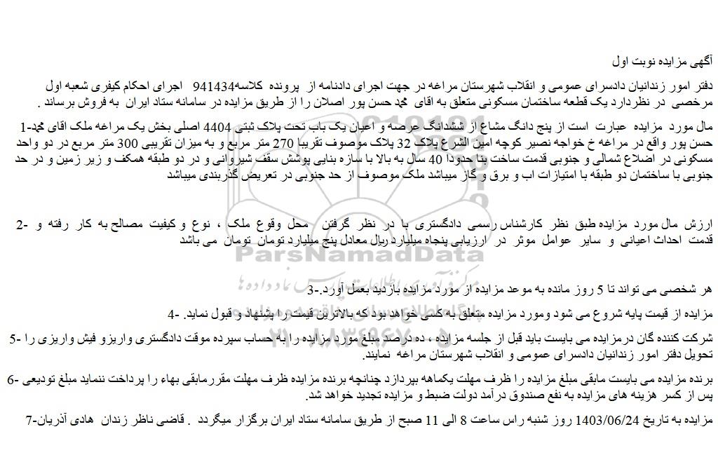 دفتر امور زندانیان دادسرای عمومی و انقلاب شهرستان مراغه در جهت اجرای دادنامه از پرونده کلاسه941434 اجرای احکام کیفری شعبه اول مرخصی در نظردارد یک قطعه ساختمان مسکونی متعلق به اقای محمد حسن پور اصلان را از طریق مزایده در سامانه ستاد ایران به فروش برساند .
