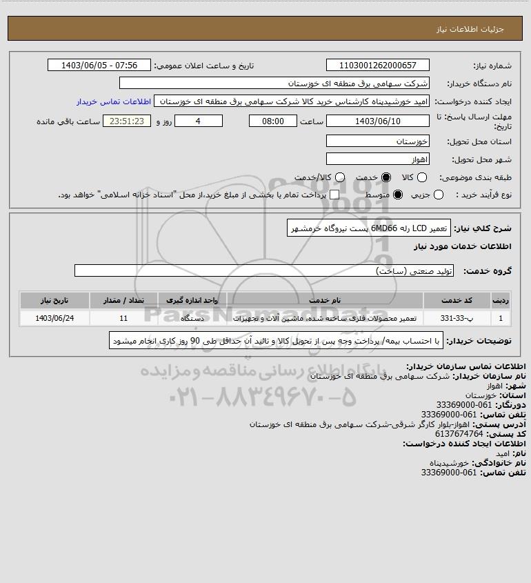 شرح کلی نیاز: تعمیر LCD رله 6MD66 پست نیروگاه خرمشهر