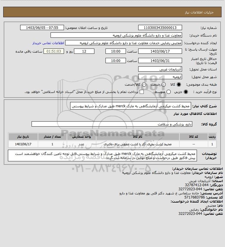 نام دستگاه خریدار:معاونت غذا و دارو دانشگاه علوم پزشکی ارومیه
