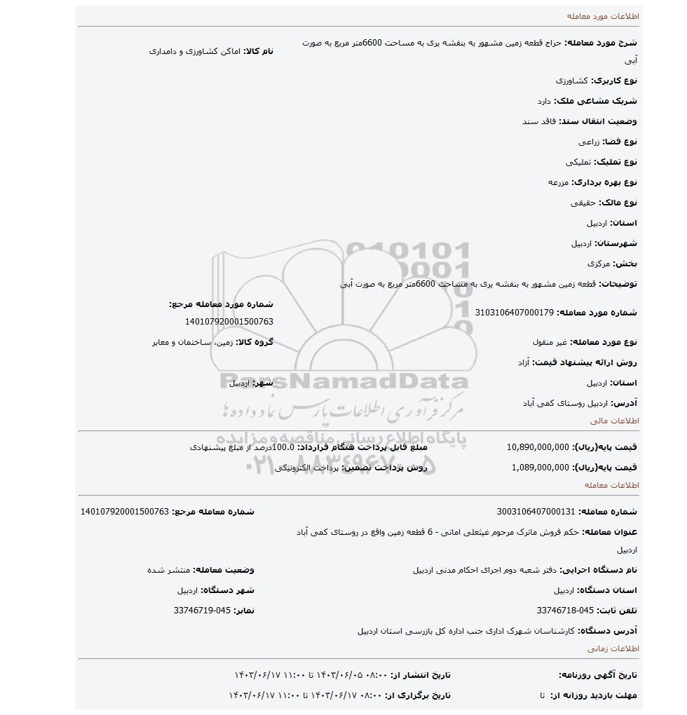 عنوان معامله: حکم فروش ماترک مرحوم غیثعلی امانی - 6 قطعه زمین واقع در روستای کمی آباد اردبیل