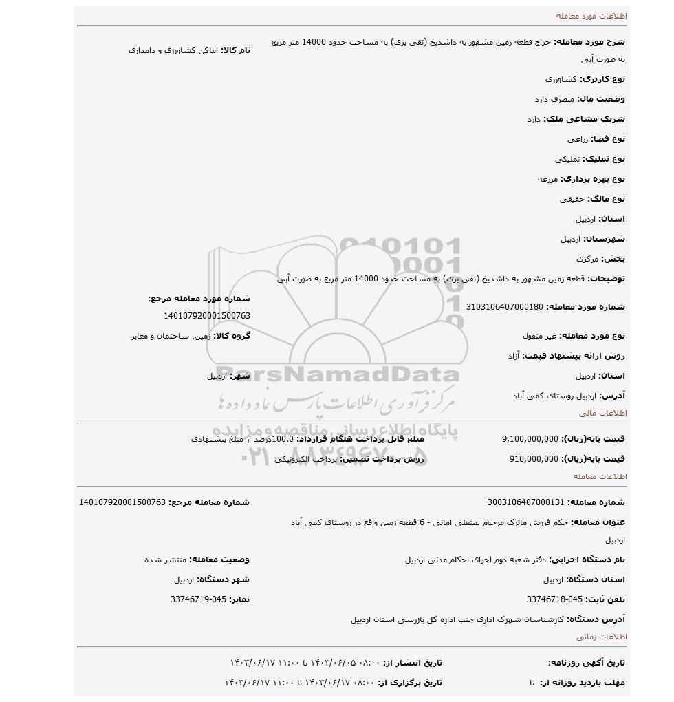شرح مورد معامله: حراج قطعه زمین مشهور به داشدیخ (تقی یری) به مساحت حدود 14000 متر مربع به صورت آبی | نام کالا: اماکن کشاورزی و دامداری | |
