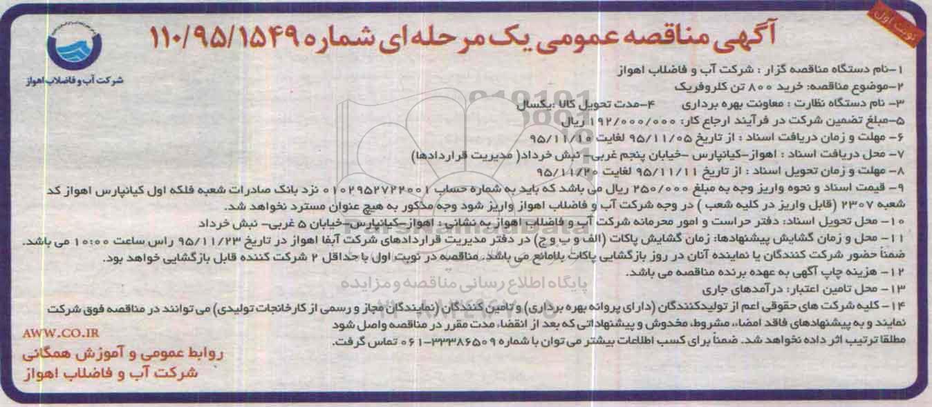 مناقصه خرید 800 تن کلروفریک , آگهی مناقصه عمومی یک مرحله ای , مناقصه خرید 800 تن کلروفریک