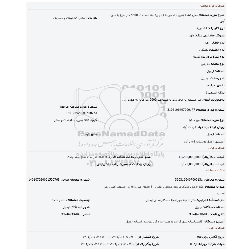 شرح مورد معامله: حراج قطعه زمین مشهور به اباذر یری به مساحت 5600 متر مربع به صورت آبی | نام کالا: اماکن کشاورزی و دامداری | |