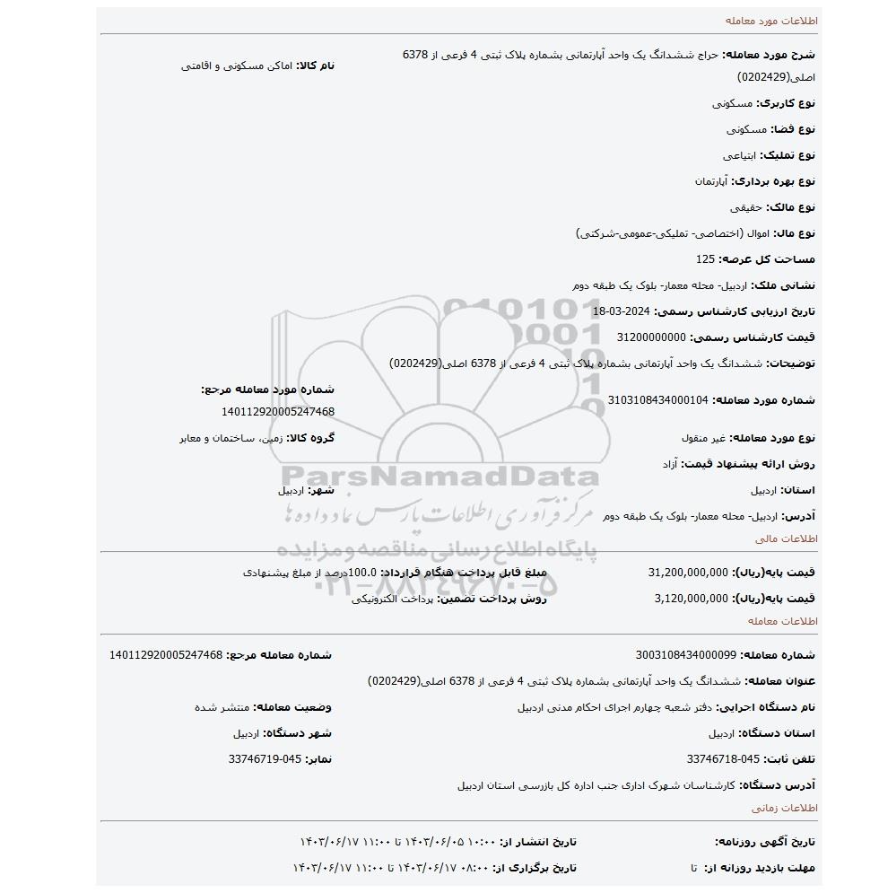 عنوان معامله: ششدانگ یک واحد آپارتمانی بشماره پلاک ثبتی 4 فرعی از 6378 اصلی(0202429) | ||