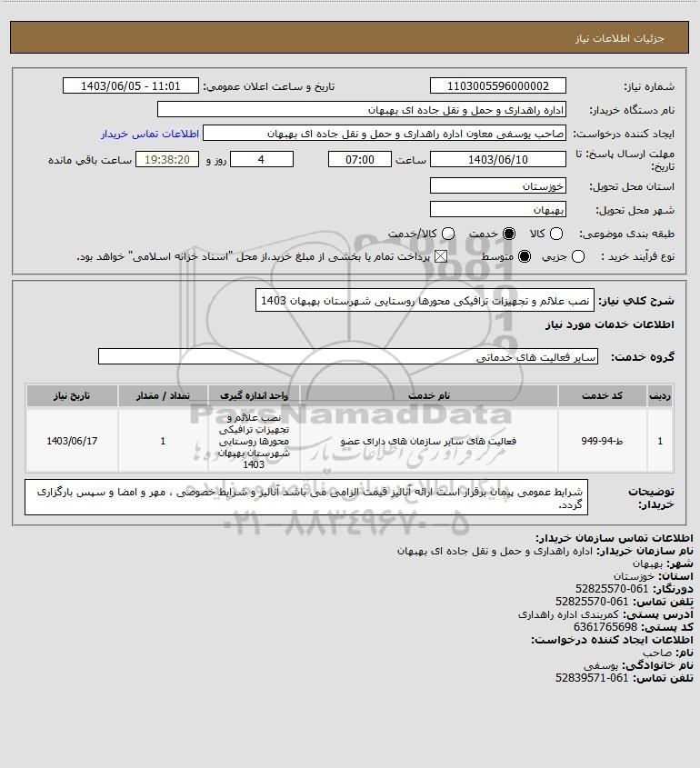 شرح کلی نیاز: نصب علائم و تجهیزات ترافیکی محورها روستایی شهرستان بهبهان 1403