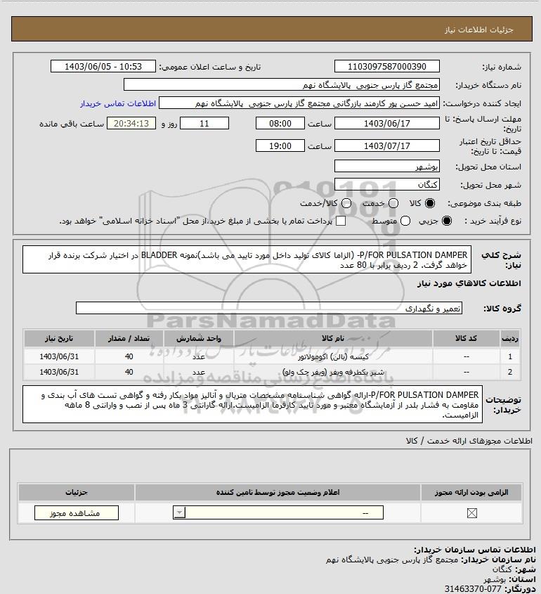 استعلام P/FOR PULSATION DAMPER- (الزاما کالای تولید داخل مورد تایید می باشد)نمونه BLADDER در اختیار شرکت برنده قرار خواهد گرفت. 2 ردیف برابر با 80 عدد, استعلام P/FOR PULSATION DAMPER- (الزاما کالای تولید داخل مورد تایید می باشد)نمونه BLADDER در اختیار شرکت برنده قرار خواهد گرفت. 2 ردیف برابر با 80 عدد
