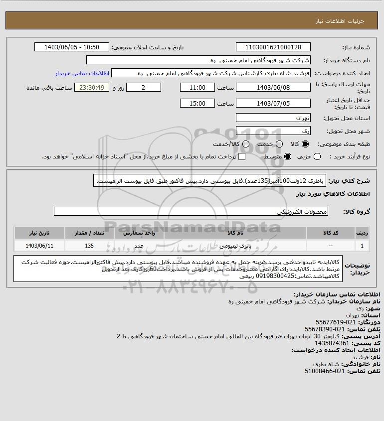 استعلام باطری 12ولت100آمپر(135عدد).فایل پیوستی دارد.پیش فاکتور طبق فایل پیوست الزامیست., استعلام باطری 12ولت100آمپر(135عدد).فایل پیوستی دارد.پیش فاکتور طبق فایل پیوست الزامیست.