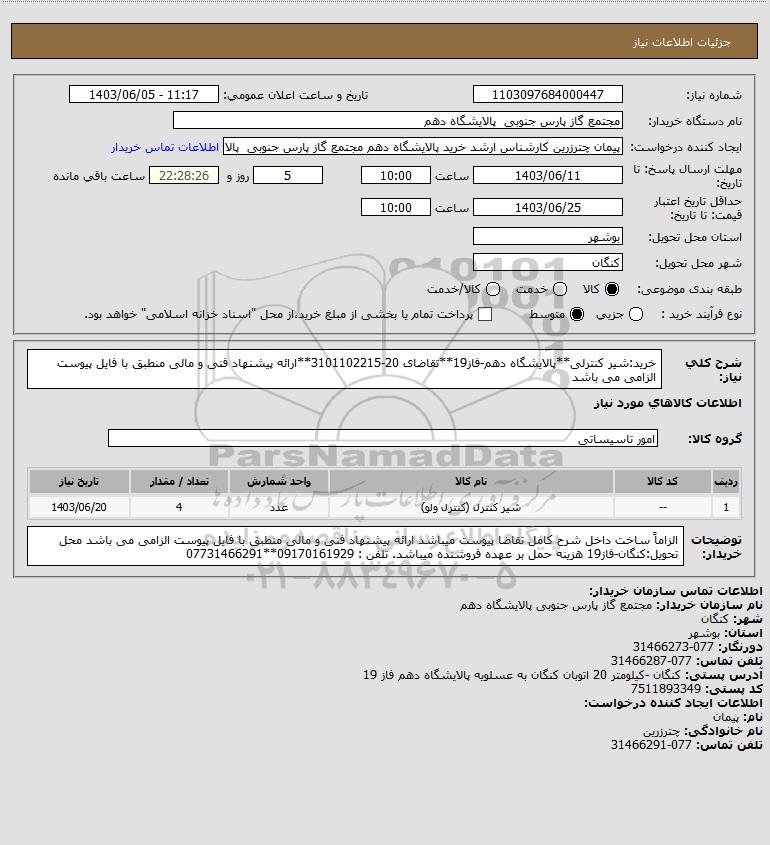 شرح کلی نیاز: خرید:شیر کنترلی**پالایشگاه دهم-فاز19**تقاضای 20-3101102215**ارائه پیشنهاد فنی و مالی منطبق با فایل پیوست الزامی می باشد