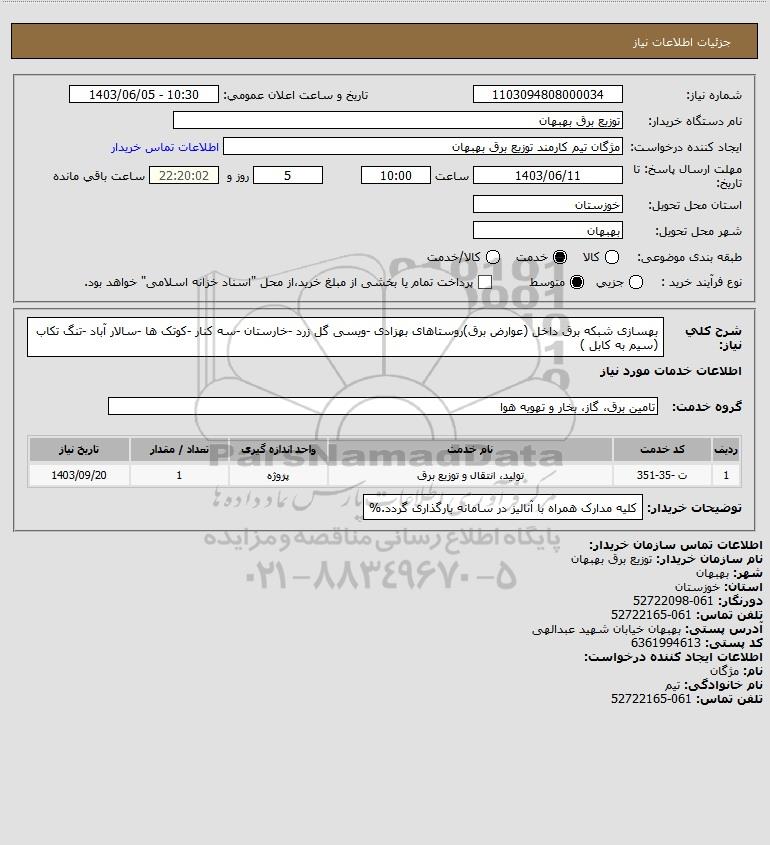 شرح کلی نیاز: بهسازی شبکه برق داخل (عوارض برق)روستاهای بهزادی -ویسی گل زرد -خارستان -سه کنار -کوتک ها -سالار آباد -تنگ تکاب (سیم به کابل )
