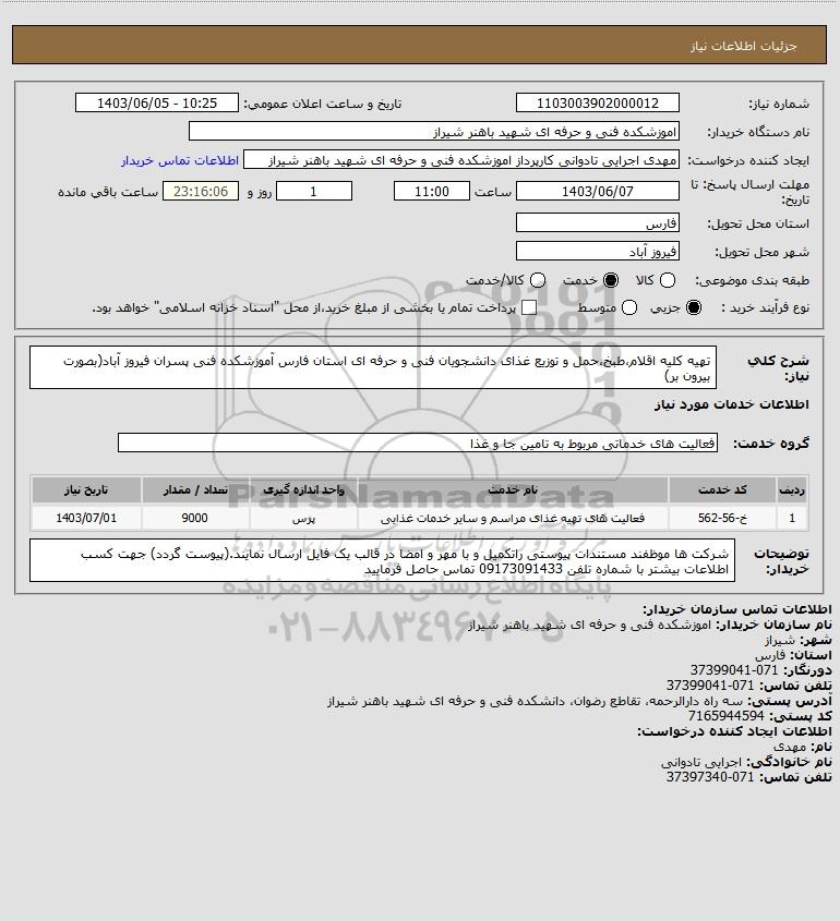 شرح کلی نیاز: تهیه کلیه اقلام،طبخ،حمل و توزیع غذای دانشجویان فنی و حرفه ای استان فارس آموزشکده فنی پسران فیروز آباد(بصورت بیرون بر)