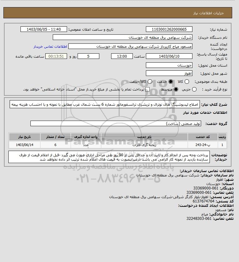 شرح کلی نیاز: اصلاح لیدبوشینگ های نوترال و تریشری ترانسفورماتور شماره 6 پست شمال غرب مطابق با نمونه و با احتساب هزینه بیمه