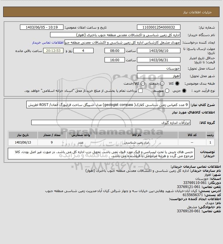 نام دستگاه خریدار:اداره کل زمین شناسی و اکتشافات معدنی منطقه جنوب باختری (اهواز)