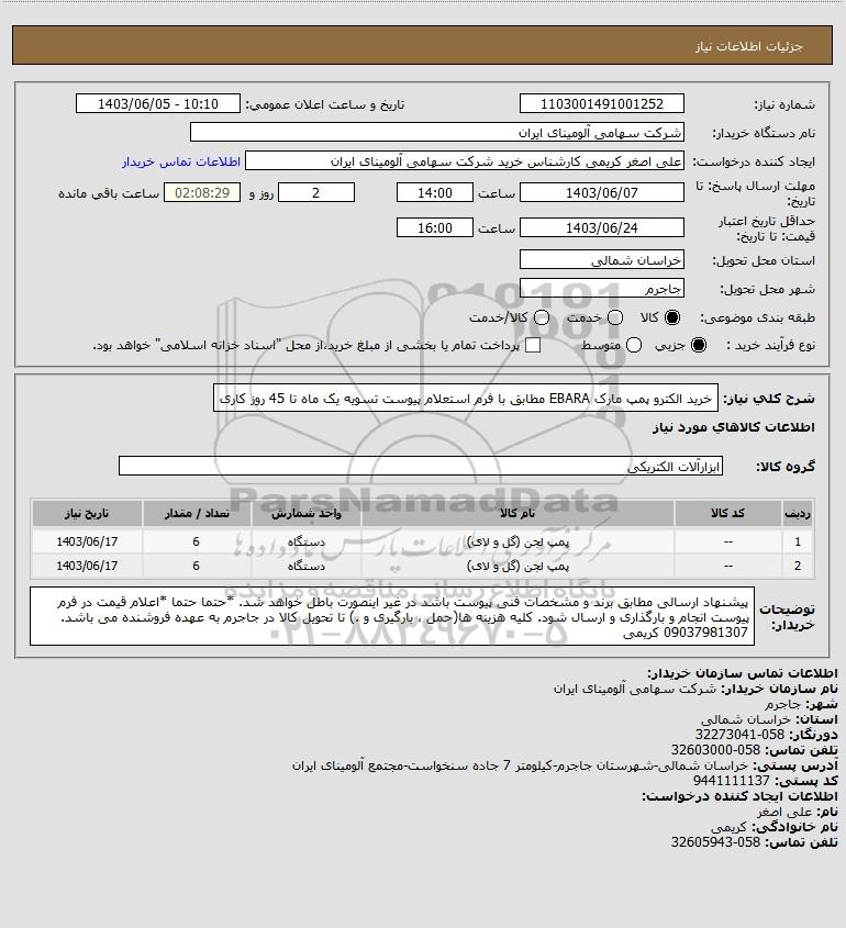 شرح کلی نیاز: خرید الکترو پمپ مارک EBARA مطابق با فرم استعلام پیوست