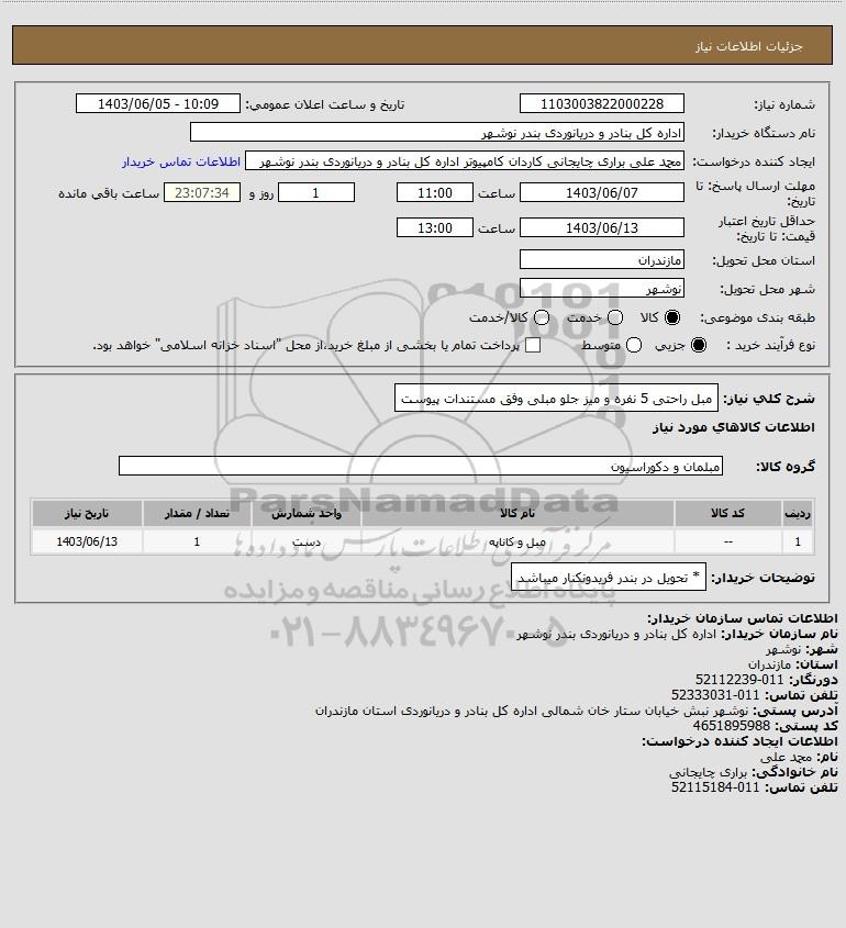 شرح کلی نیاز: مبل راحتی 5 نفره و میز جلو مبلی وفق مستندات پیوست