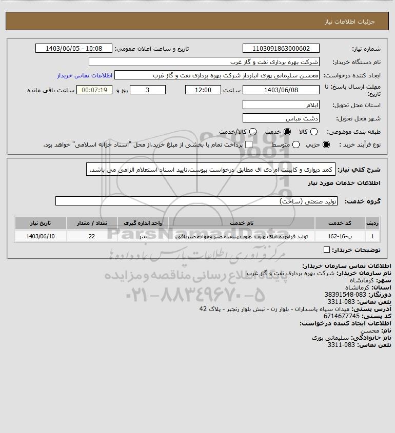 شرح کلی نیاز: کمد دیواری و کابینت ام دی اف مطابق درخواست پیوست.تایید اسناد استعلام الزامی می باشد.