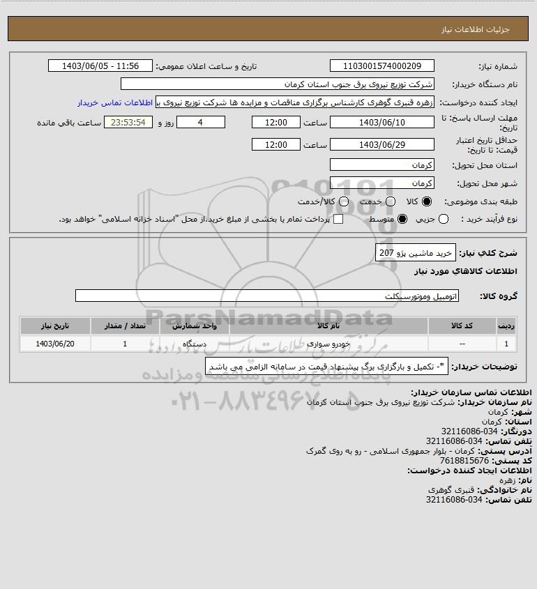 نام دستگاه خریدار:شرکت توزیع نیروی برق جنوب استان کرمان