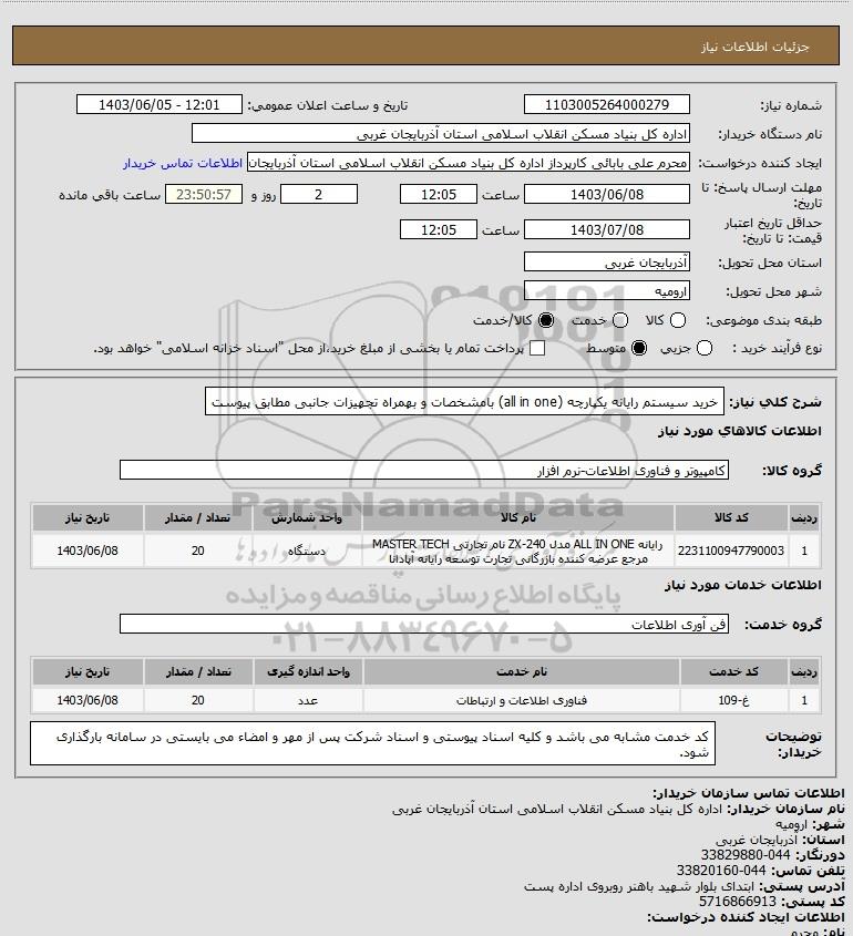 شرح کلی نیاز: خرید سیستم رایانه یکپارچه (all in one) بامشخصات و بهمراه تجهیزات جانبی مطابق پیوست