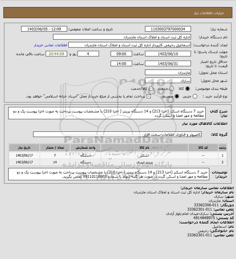 شرح کلی نیاز: خرید 7 دستگاه اسکنر (اخزا 213) و 14 دستگاه پرینتر ( اخزا 210) با مشخصات پیوست