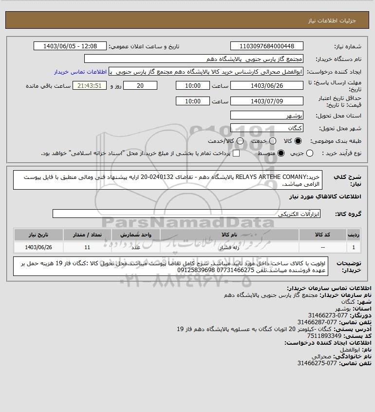 شرح کلی نیاز: خرید:RELAYS ARTEHE COMANY پالایشگاه دهم - تقاضای 0240132-20 ارایه پیشنهاد فنی ومالی منطبق با فایل پیوست الزامی میباشد.