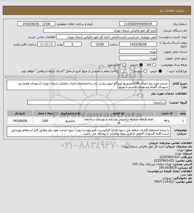 شرح کلی نیاز: خدمت مورد نیاز اجرای 2200مترمربع ایزوگام جهت پشت بام ساختمانهای ادارات مالیاتی شمال تهران (شهدای هفتم تیر-شهدای گمنام وشهدای هشتم شهریور)